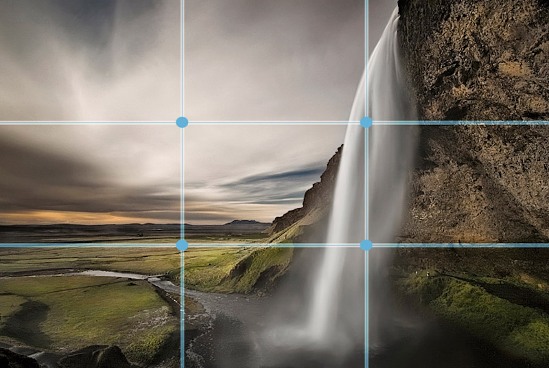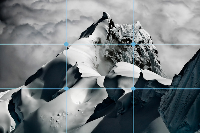 Kadr dzielimy na trzy równej wielkości pasy w pionie i w poziomie. Linie biegnące na połączeniu tych pasów przecinają się w 4 punktach, które nazywamy mocnymi punktami kadru:
